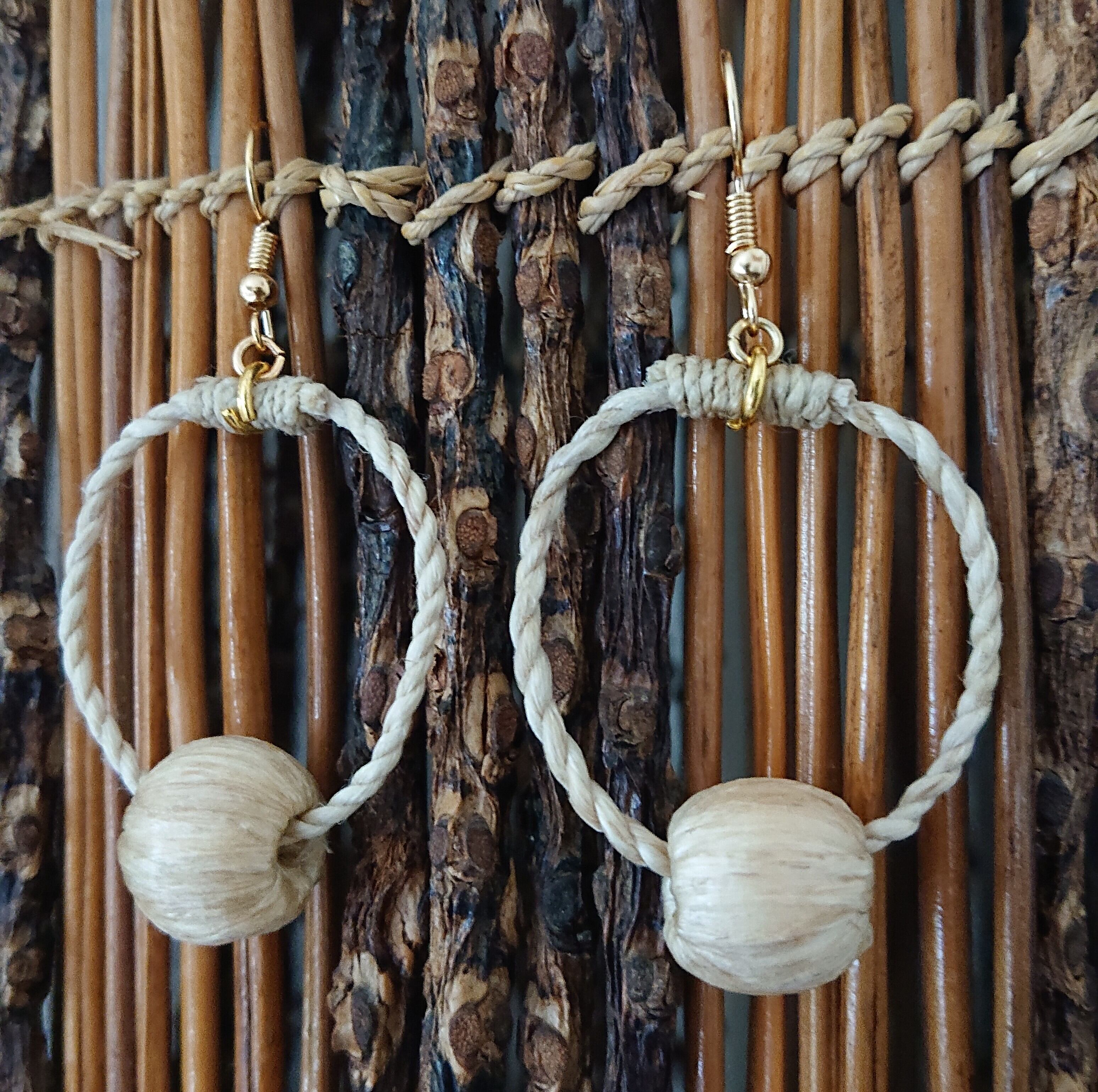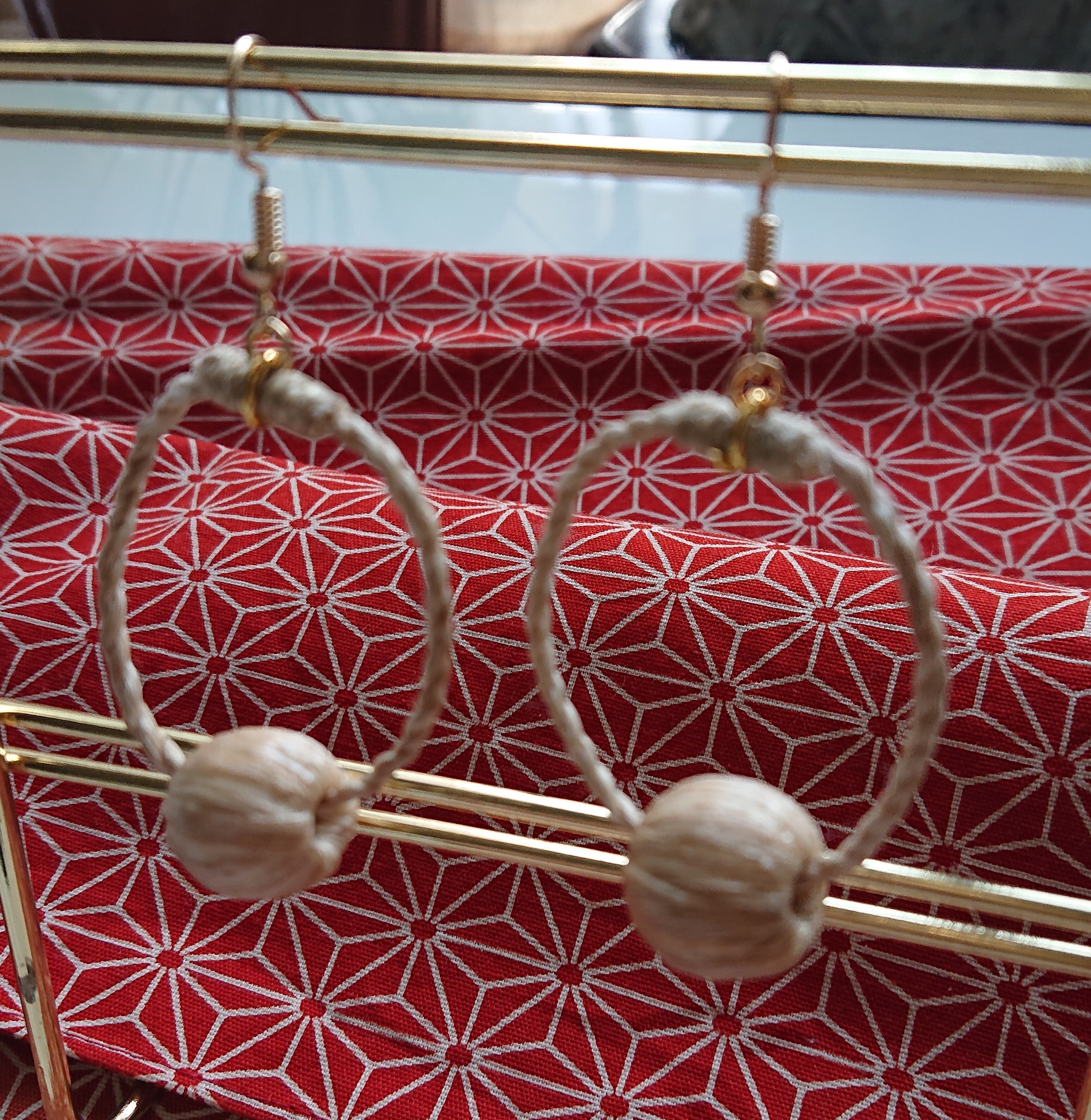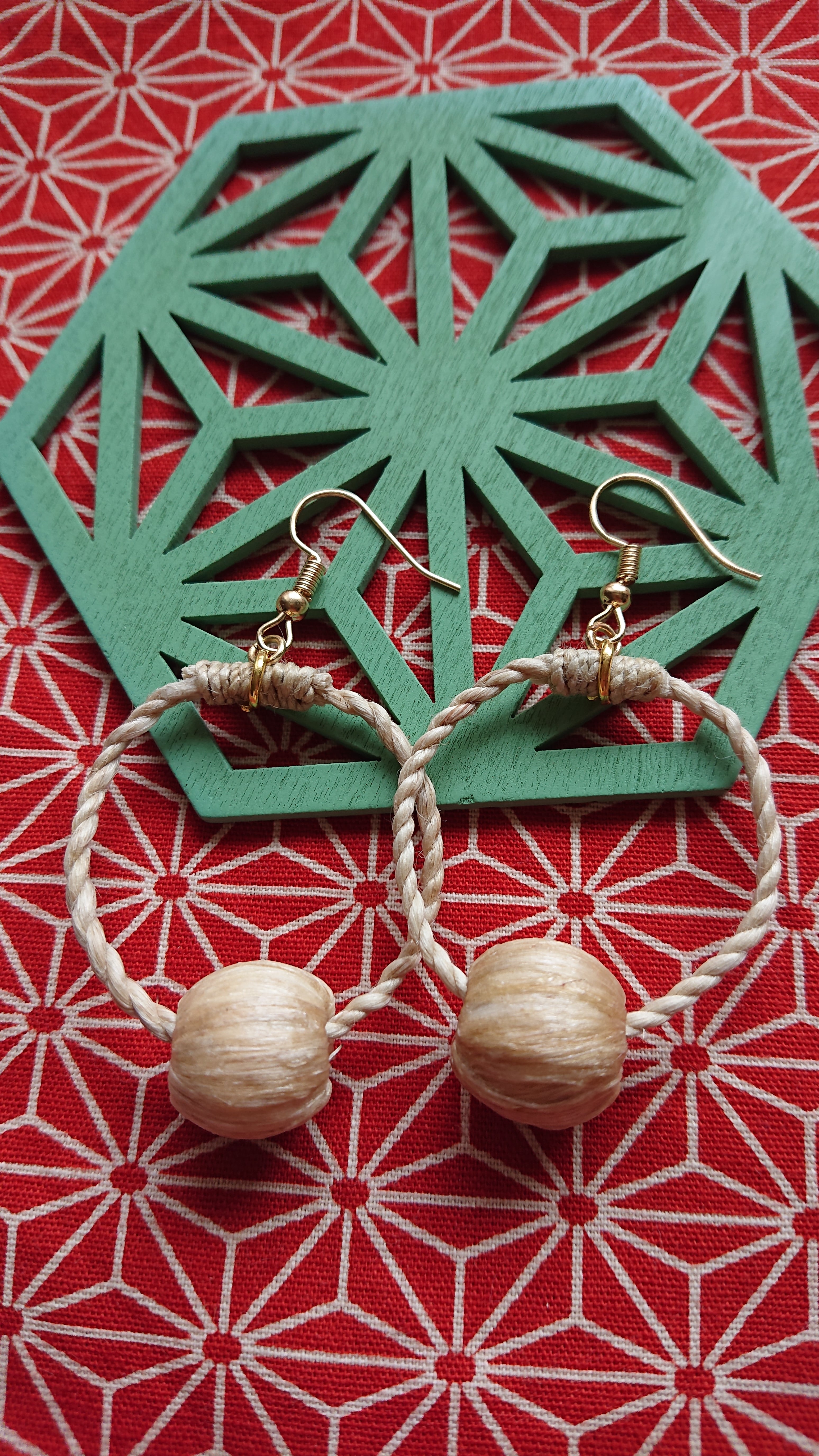 新作の麻玉を使ったピアス 『ひと輪』 輪の直径は約3cm 麻玉は約14mm ☆麻玉ピアスを手にした方から 耳につけたら何だか身体が楽になった 和むと言う感想を頂きました。